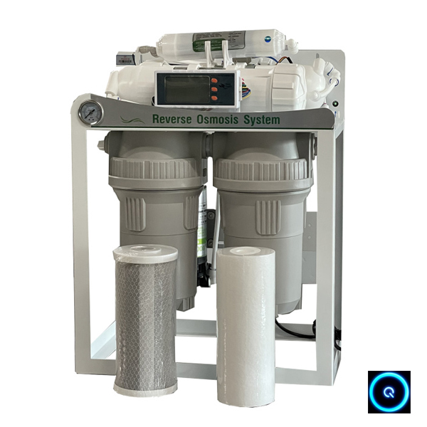 600 BB (800/800) LCD átfolyó rendszerű RO víztisztító, 2db 800 GPD nagy kapacitású membránnal és 10″-os Big Blue előszűrőkkel van szerelve, képes közvetlenül, külön tartály alkalmazása nélkül tiszta vizet előállítani stabilan, nagy mennyiségben. Irodáknak, munkahelyeknek, kávéházaknak is ideális választás, több ember fogyasztását is képes kiszolgálni. Kisebb igényű ipari felhasználásra, laboratóriumoknak is megfelel.